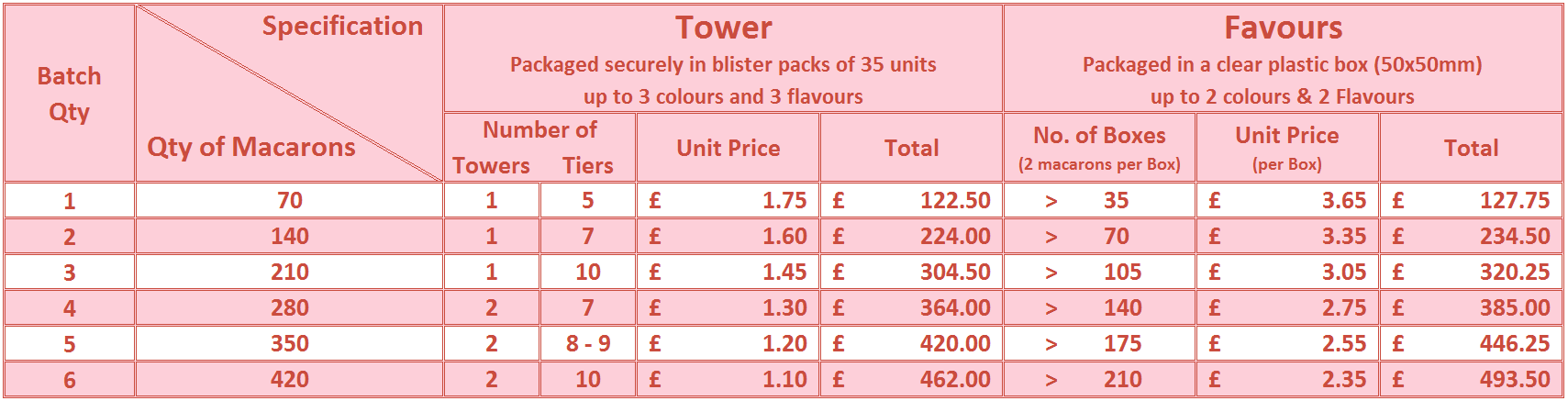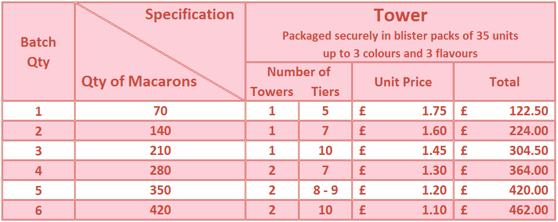 Towers: Macaron towers are an impressive 10 tiers and hold 210 macarons. You can choose up to three different flavours and colours for the macarons. We can create bespoke flavours and colours especially for your event. Price includes use of tower and robust blister packs to hold macarons securely prior to assembly on tower.